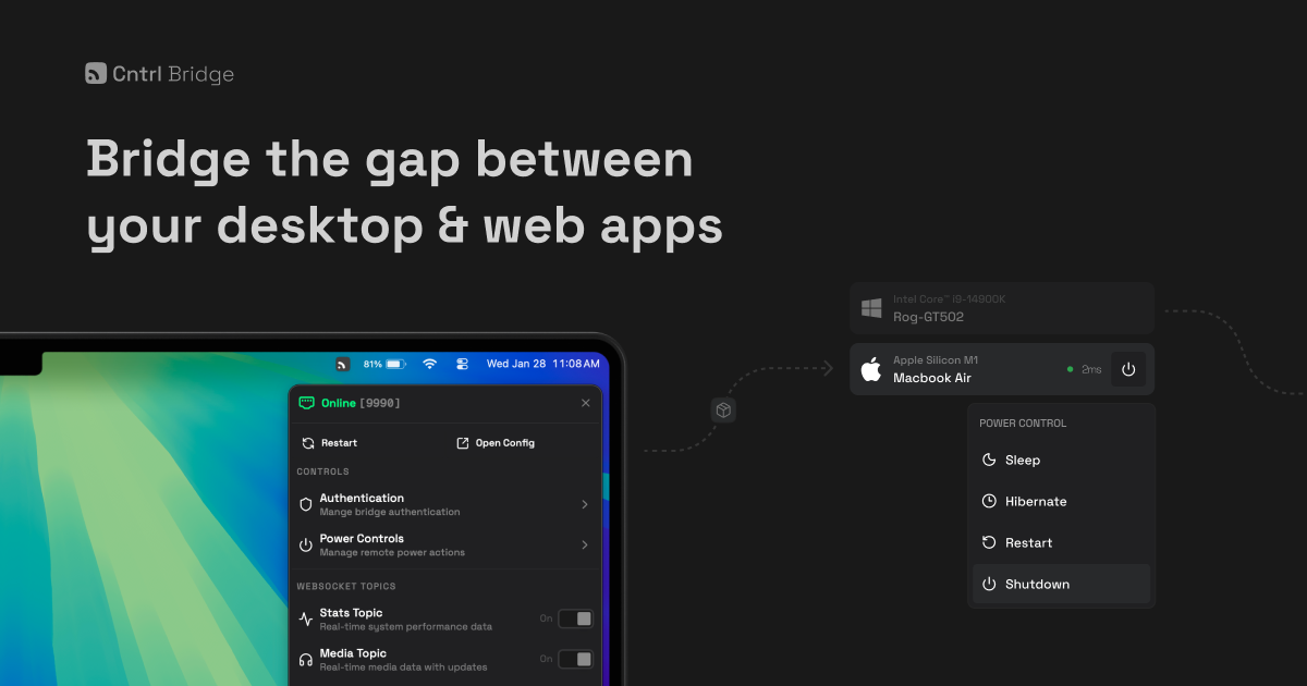A lightweight system tray agent that turns your PC into a programmable API. Monitor stats, control media, and trigger power actions via standard HTTP/WebSockets from any device or script.